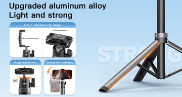 Leichtes Stativ mit 360°-Kugelkopf, 1/4" Halterung, 185 cm maximale Höhe und Bluetooth-Fernbedienung – ideal für stabiles, freihändiges Fotografieren mit Telefonen und Kameras.