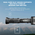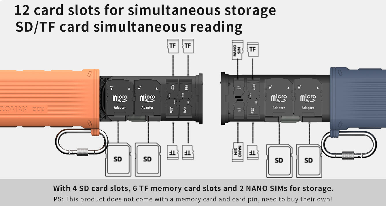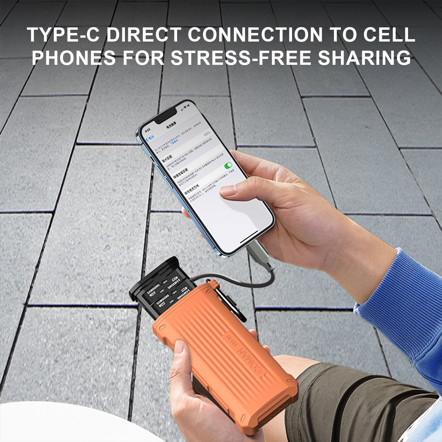 Der COMAN E10 unterstützt verschiedene Speicherkartentypen, darunter SDXC-, SDHC-, SD-, MicroSDXC-, MicroSDHC- und MicroSD-Karten. Ob Sie große Dateien übertragen oder mehrere Karten verwalten, die zwei Kartensteckplätze und das vielseitige Design bieten zuverlässige Leistung und Speicherplatz.