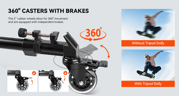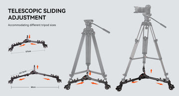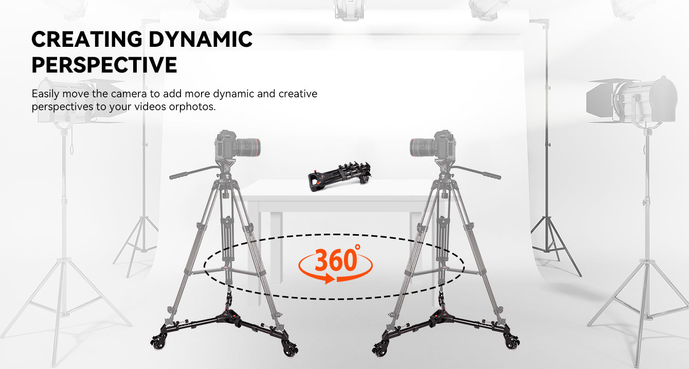 【Glatte und langlebige Räder】Der professionelle Stativwagen mit Rädern ist ein Kamerawagen, der für Kamerastative und einfache Actionfotografie entwickelt wurde. Ausgestattet mit 3-Zoll-Rädern mit Einzelbremsen und Zugschnallen-Verriegelung für erhöhte Stabilität. Der Stativwagen ist fachmännisch aus einer robusten und dennoch leichten Aluminiumlegierung gefertigt und bietet so Langlebigkeit und einfache Mobilität über Jahre hinweg.