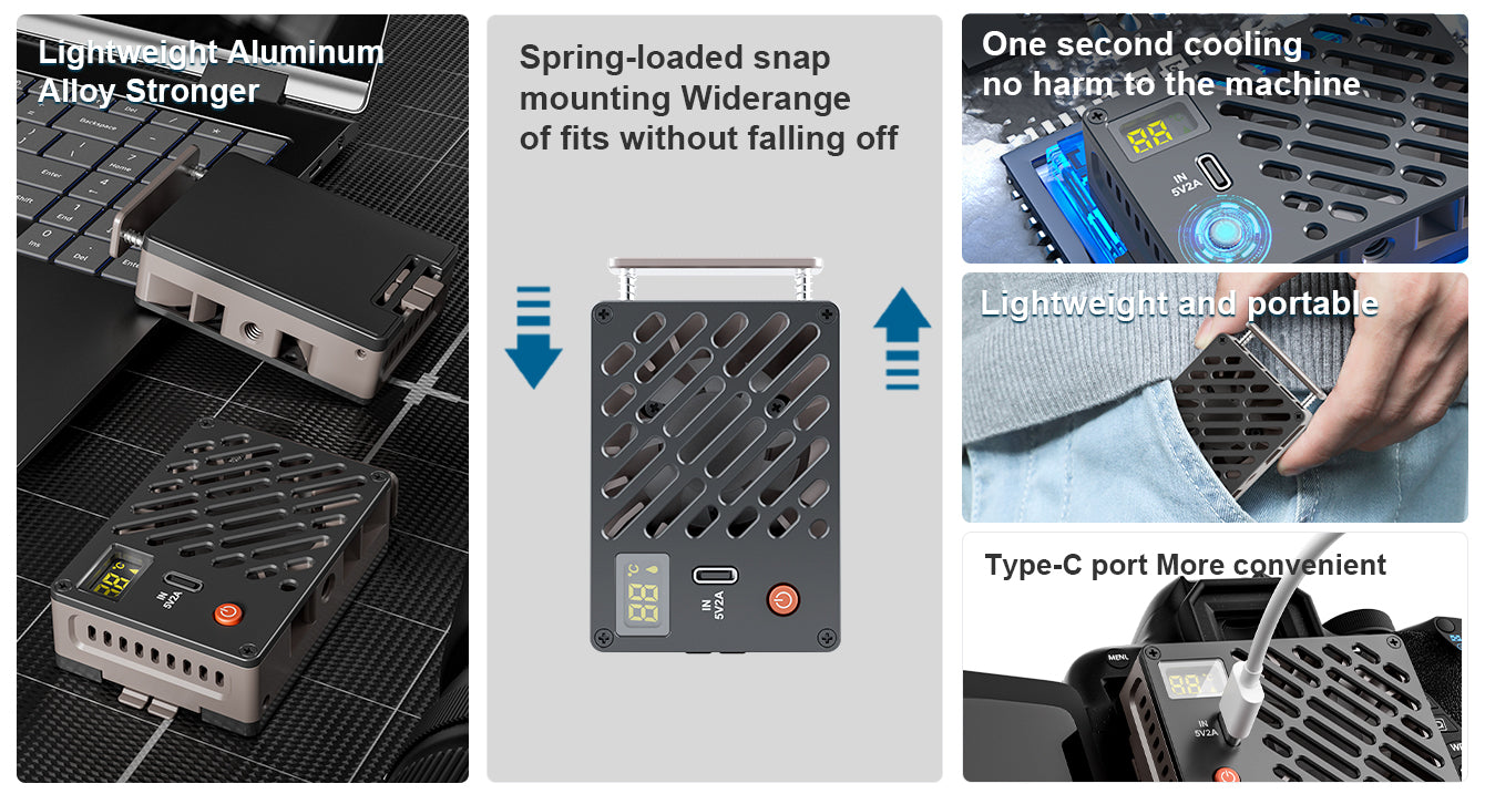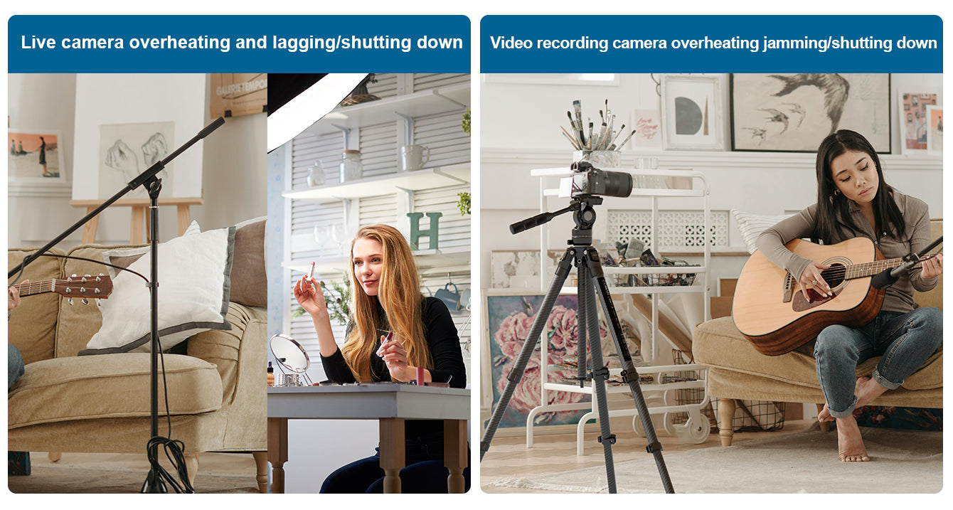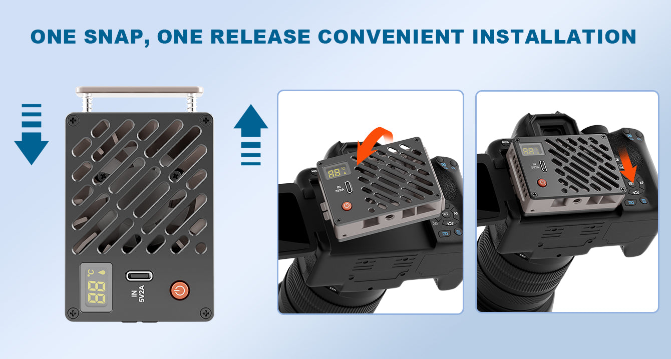 【COMAN E11 Camera Cooler】Designed for professional photographers, the COMAN E11 is an efficient cooling solution with an aluminum alloy case for better heat dissipation and durability. Compatible with Sony, Canon, and Fuji cameras, it features a Type-C port, powerful cooling, and low-noise performance. Perfect for long live recordings without stuttering.