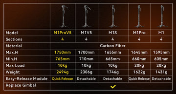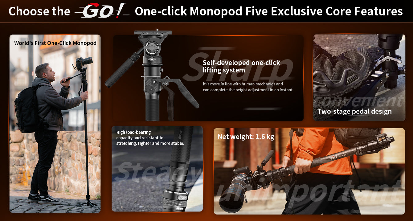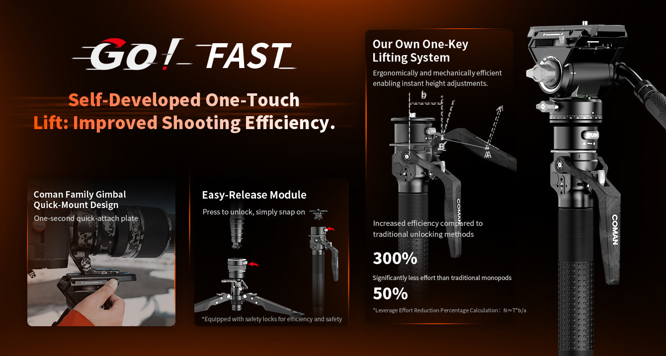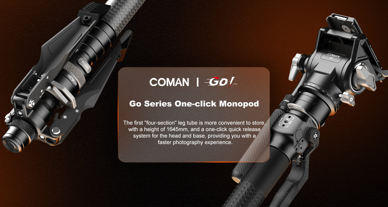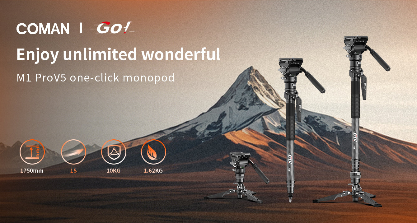 【COMAN M1Pro V5 – World's First One-Click, Four-Section Monopod】Equipped with a self-developed one-click lifting system and an innovative four-section carbon fiber leg, the M1Pro V5 offers unmatched convenience in height adjustment. With just one press, extend or retract your monopod instantly — boosting setup speed by up to 300% compared to traditional designs.