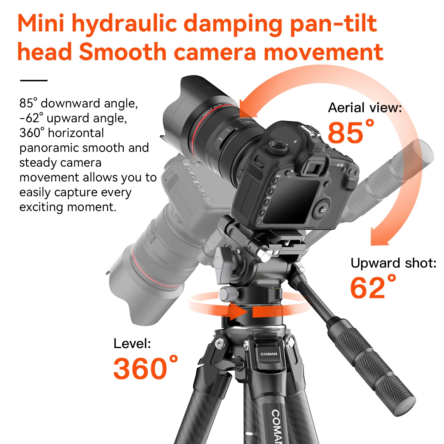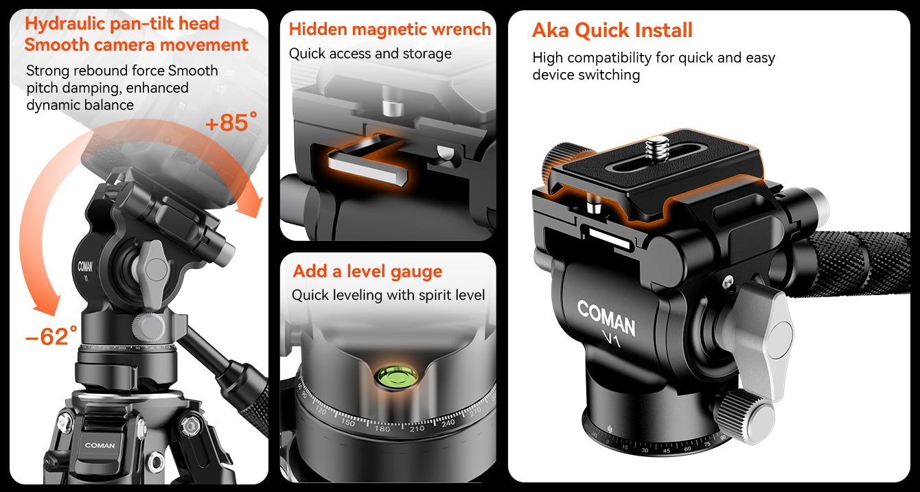 【Smooth Hydraulic Motion】The COMAN V1 features a mini hydraulic gimbal with precision damping, providing ultra-smooth panning and tilting. Whether you are capturing cinematic shots or professional video, this hydraulic system ensures motion is fluid and stable, eliminating jerky movements for truly professional results.