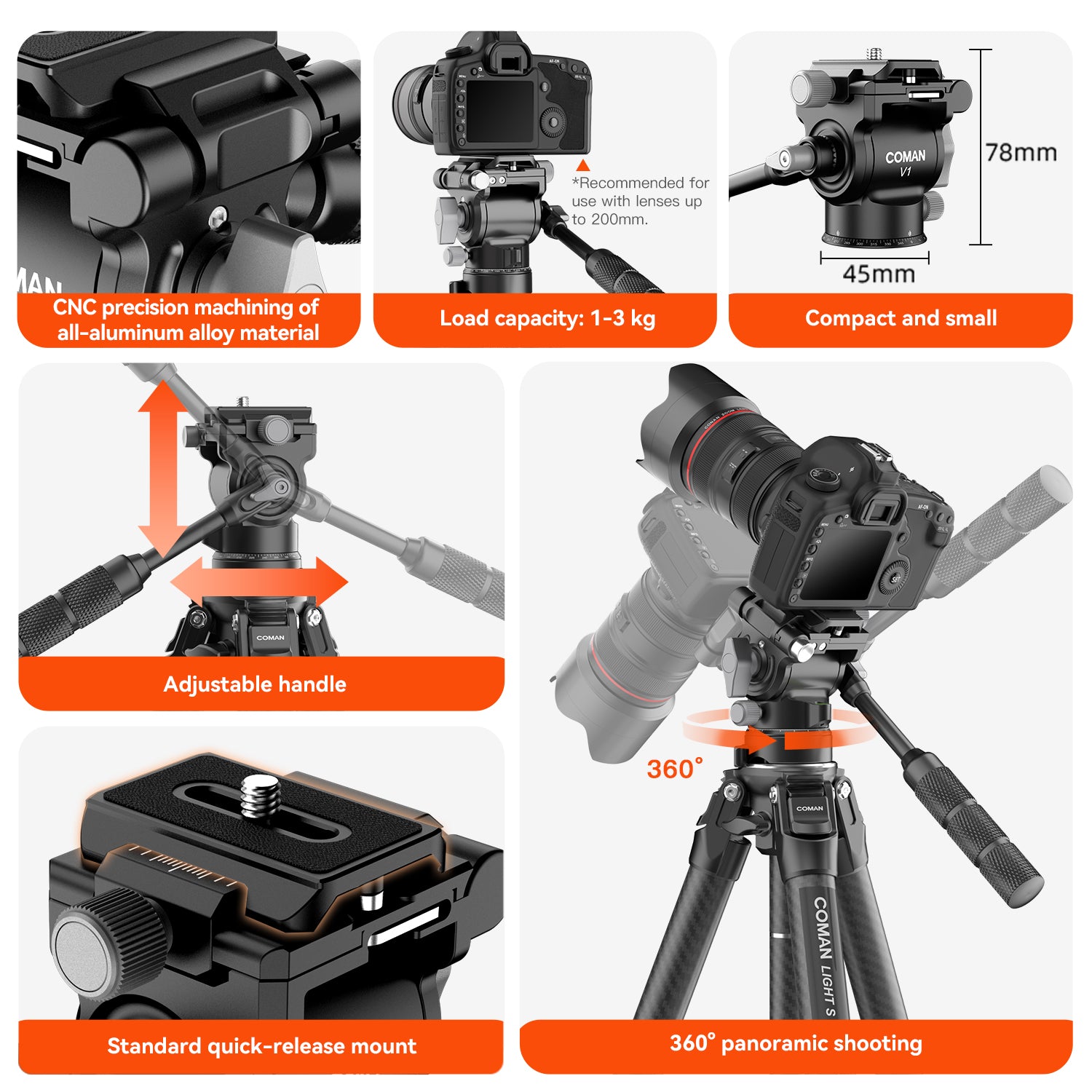 COMAN V1 Portable Hydraulic Camera Head – Mini Aluminum Gimbal, Smooth Motion, 360° Pan, Tilt +85°/-62°, Vertical & Horizontal Shooting, 1–3KG Payload