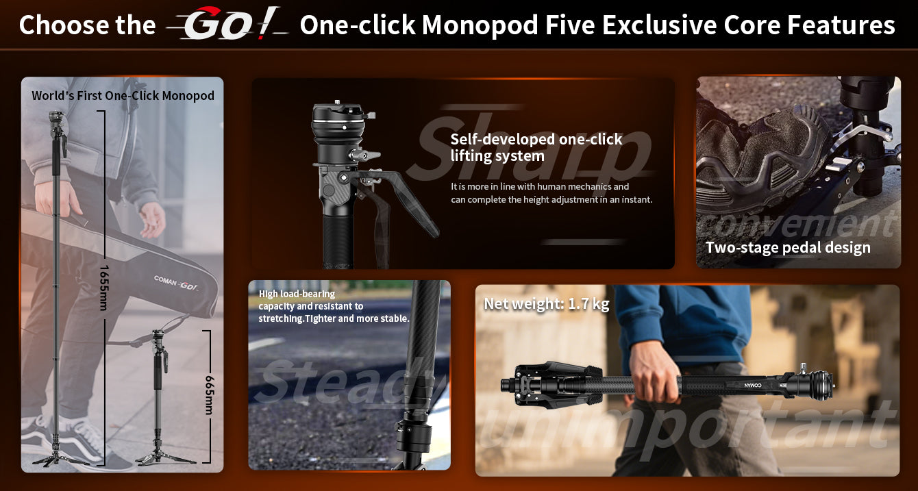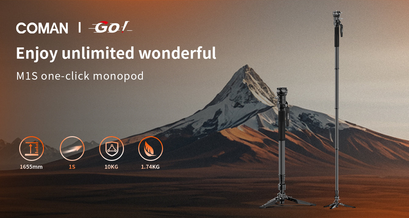 【Self-Developed One-Click Lifting System】The M1S features COMAN’s ergonomic one-touch height adjustment system, enabling smooth and instant elevation changes—up to 1655mm—improving shooting efficiency by up to 300% over traditional monopods.