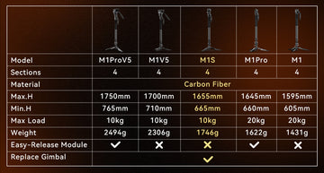 【Tall Yet Travel-Friendly】At full height (1655mm), the M1S offers extended reach for overhead or dynamic angles. Folded to just 665mm, it fits easily in most carry bags for convenient portability.